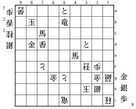 Nel diagramma a fianco, un esempio di jishogi. La partita è la 1^ della finale del 40° titolo Meijin, fra Kato Hifumi (Judan) e Nakahara Makoto (Meijin), giocata il 13/14 Aprile 1982. Kato, che giocava con il Nero, ha ottenuto finora 20 punti (pezzi di riserva + pezzi nel campo avversario). Inoltre ha altri 5 pezzi che possono raggiungere il campo avversario (9 possibili punti). Nakahara ha 23 punti (più altri 2 possibili). I giocatori, valutato che non possono conquistare pezzi avversari, si sono accordati sul jishogi. Curiosità: questa è stato solo il 5° jishogi nei primi 40 anni della storia moderna del titolo Meijin. |