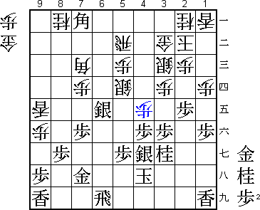 Sente: Satoshi Murayama 8-dan Gote: Kosuke Tamura 4-dan Event: 30th Quickplay Tournament, Final Date: 1997 February 1st Opening: Yagura1 P7f P8d 2 S6h P3d 3 S7g P8e 4 P2f S3b 5 G7h S6b 6 P5f P5d 7 S4h G65b 8 K6i P4d 9 P3f S3c 10 G5h B3a 11 B7i P7d 12 P6f G4c 13 G56g G3b 14 S3g K4a 15 S4f P7e 16 P7e B7e 17 N3g P4e 18 N4e S2b 19 P5e P4d 20 P5d G5d 21 R5h P5e 22 S7f B4b 23 S5e G4e 24 S5d G3f 25 P5c P5a 26 P6e P8f 27 P8f P4e 28 R5f B3c 29 R3f B9i+ 30 G4c L4b 31 G3b K3b 32 B8h +B8h 33 G8h G4d 34 B6a S3c 35 P3e P3e 36 R5f N5e 37 P3d S2d 38 G6f G5d 39 G5e G5e 40 R5e G4d 41 P5b+ P5b 42 R5b+ S*5a 43 N5f R8d 44 G3a K3a 45 G4a K2b 46 G5a G4c 47 +R6b R8f 48 G8g B5g 49 S6h 1-0